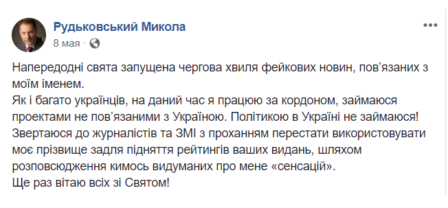 "Запущена очередная волна фейковых новостей, связанных с моим именем. Как и многие украинцы, в настоящее время я работаю за границей, занимаюсь проектами, не связанными с Украиной. Политикой в Украине не занимаюсь! Обращаюсь к журналистам и СМИ с просьбой перестать использовать мою фамилию ради поднятия рейтингов ваших изданий, путем распространения кем-то выдуманных обо мне "сенсаций", - написал он в Facebook 8 мая.