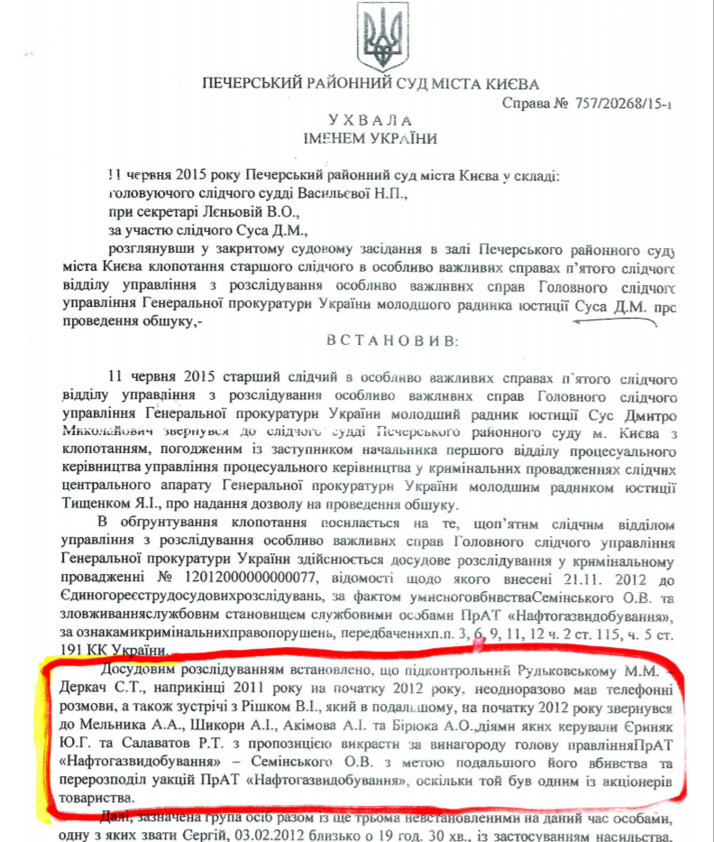 По одной из версий, жертвой этого противостояния якобы и стал экс-глава Апелляционного суда Киева Антон Чернушенко. Именно ему регулярно выпадало слушать дела об арестах скважин и счетов "Нефтегаздобычи", которые он выносил в пользу ДТЭК. В июне 2015 года прокуроры нагрянули в суд, и вышеупомянутый "важняк" из так называемого "Департамента Кононенко-Грановского" ГПУ Сус зачитал "пидозру" судье Чернушенко в вынесении заведомо неправосудных решений и вмешательстве в автоматизированную систему.