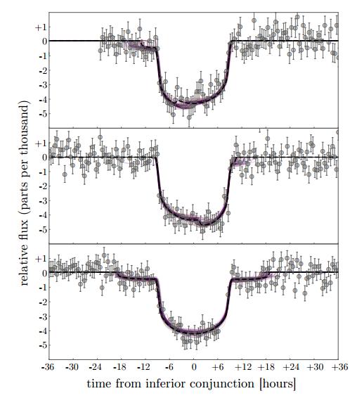 Наблюдаемые изменения блеска в системе Кеплер-1625bI в трех разных транзитах. (Время в часах от середины затмения, изменения потока от звезды показаны в тысячных долях полного потока)
