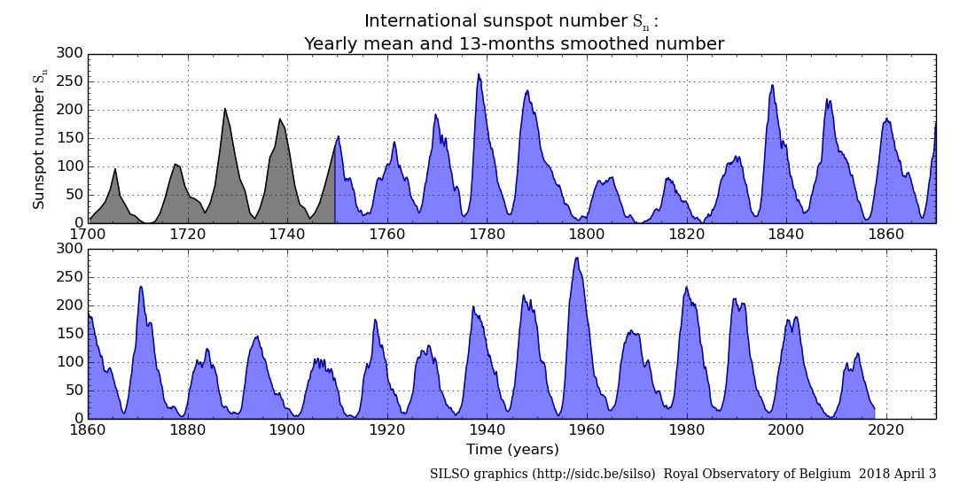 Все отслеженные цикли Солнечной активности начиная с 1700 года, показаны на этом рисунке. Следующий цикл начнется в ближайшем будущем. В 2018 кривая сползает к нулю.