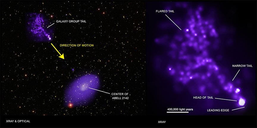 Чтобы рассмотреть уникальный хвост, обсерватории Чандра пришлось накапливать сигнал от скопления 2 дня 9 часов и 14 минут. Хвост состоит из газа, разогретого до температуры в несколько миллионов кельвинов, и активно излучающего в рентгеновском диапазоне Он оставлен группой из четырех ярких галактик, движущихся по направлению к центру Abell 2142. Ядра по меньшей мере двух из этих галактик содержат быстро растущие сверхмассивные черные дыры. Именно эти галактики видны как очень яркие рентгеновсие объекты.