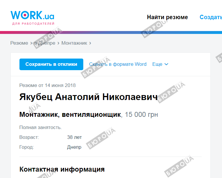 Всего месяцем ранее Якубец, как свидетельствует Work.ua, искал работу монтажника-вентиляционщика с заработной платой 15 тысяч гривен.
