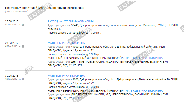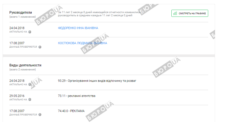 Руководителем и учредителем конторы, уставной фонд которой составляет 300 гривен. стала некто Инна Федоренко, а основным видом деятельности по КВЭД ООО вместо «рекламные агентства» стало «организация других видов отдыха и развлечений».