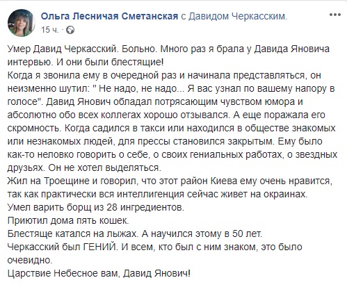 Журналистка Ольга Лесничая Сметанская в своем Facebook написала, что много раз брала у Давида Яновича интервью. Вспоминает, что он обладал потрясающим чувством юмора и абсолютно обо всех коллегах хорошо отзывался, а еще поражала его скромность.