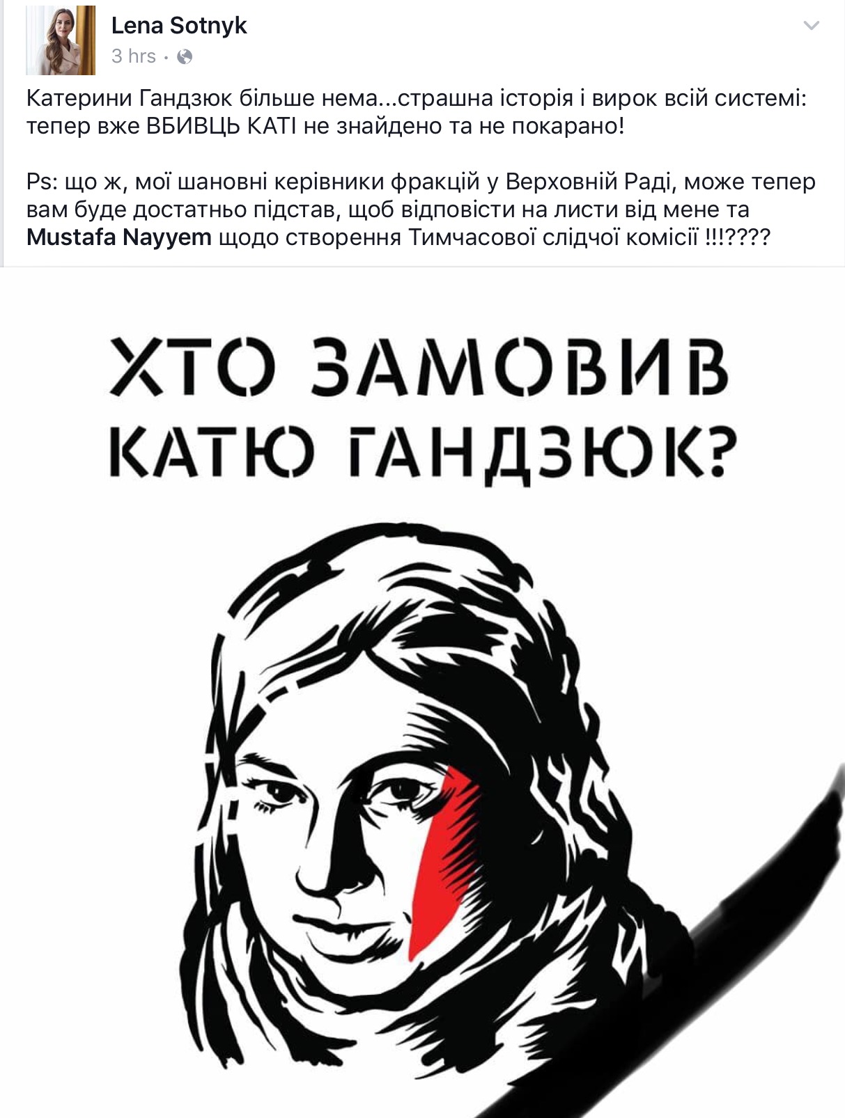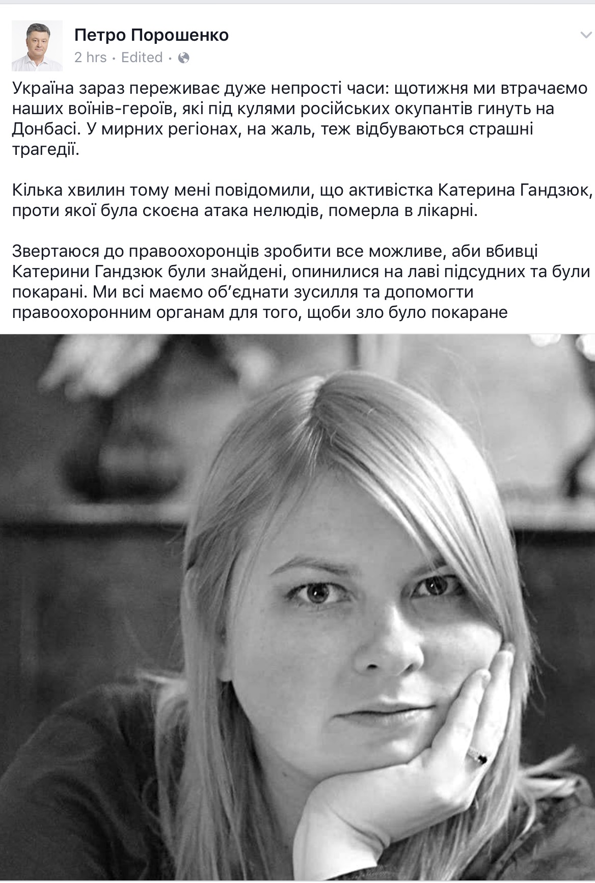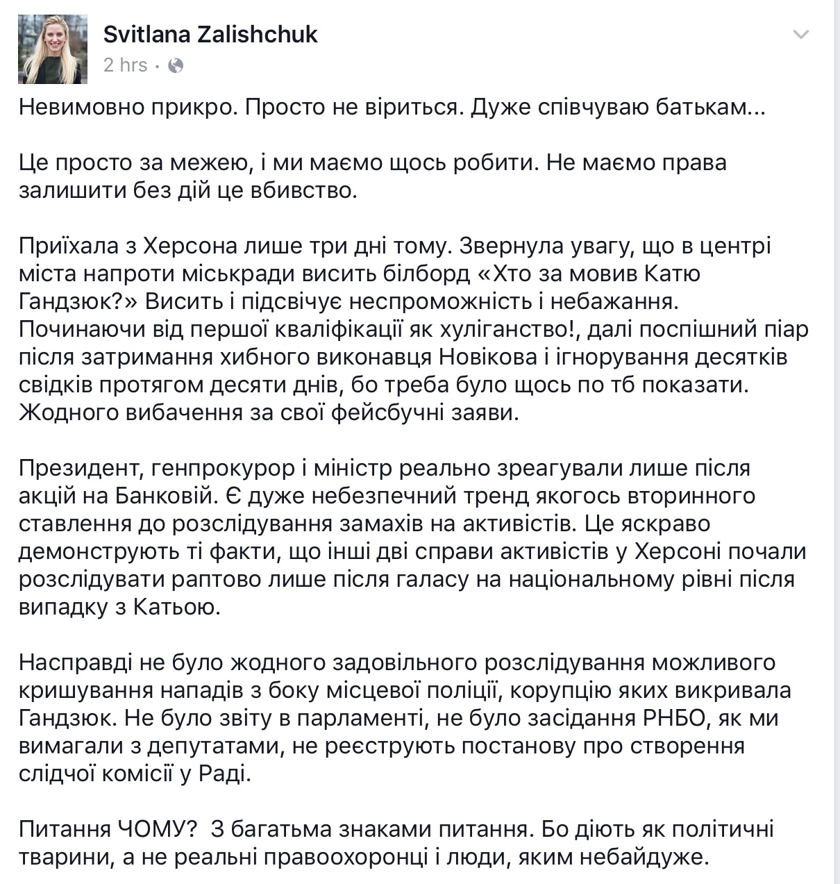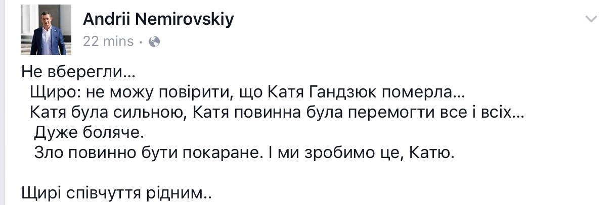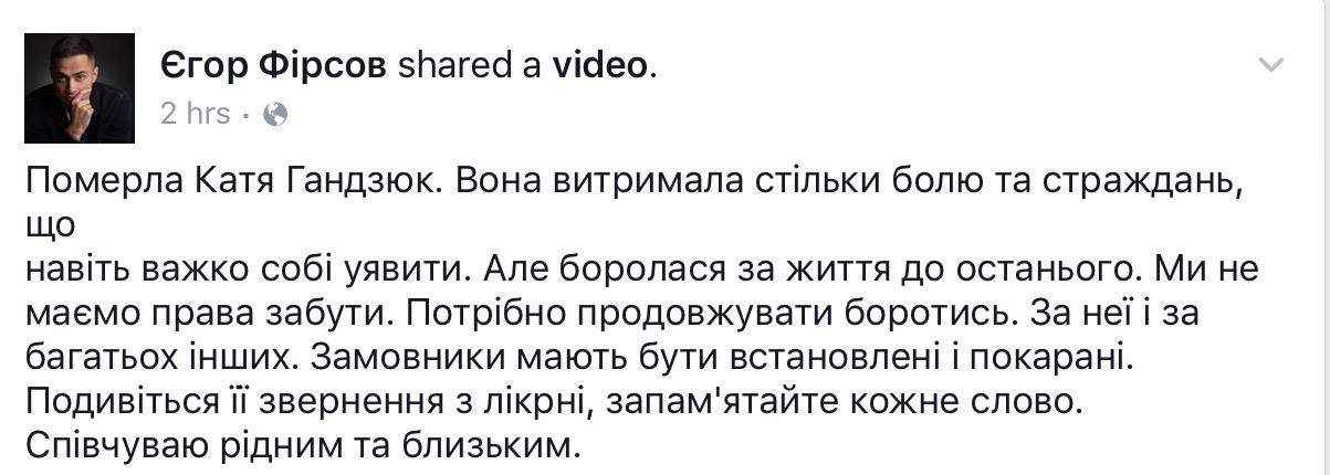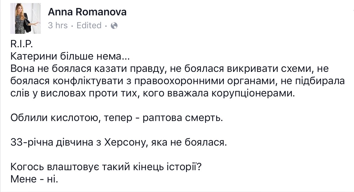 В воскресенье, 4 ноября, умерла херсонская активистка, советник мэра Херсона, и.о. управляющего делами исполнительного комитета Херсонского горсовета Екатерина Гандзюк. За несколько месяцев до этого, в июле, девушку облили серной кислотой, в результате чего она получила более 30% ожогов кожи. Воскресным вечером в Украине прошли акции памяти Гандзюк. Пользователи социальных сетей также бурно отреагировали на гибель девушки. FaceNews собрал реакции.