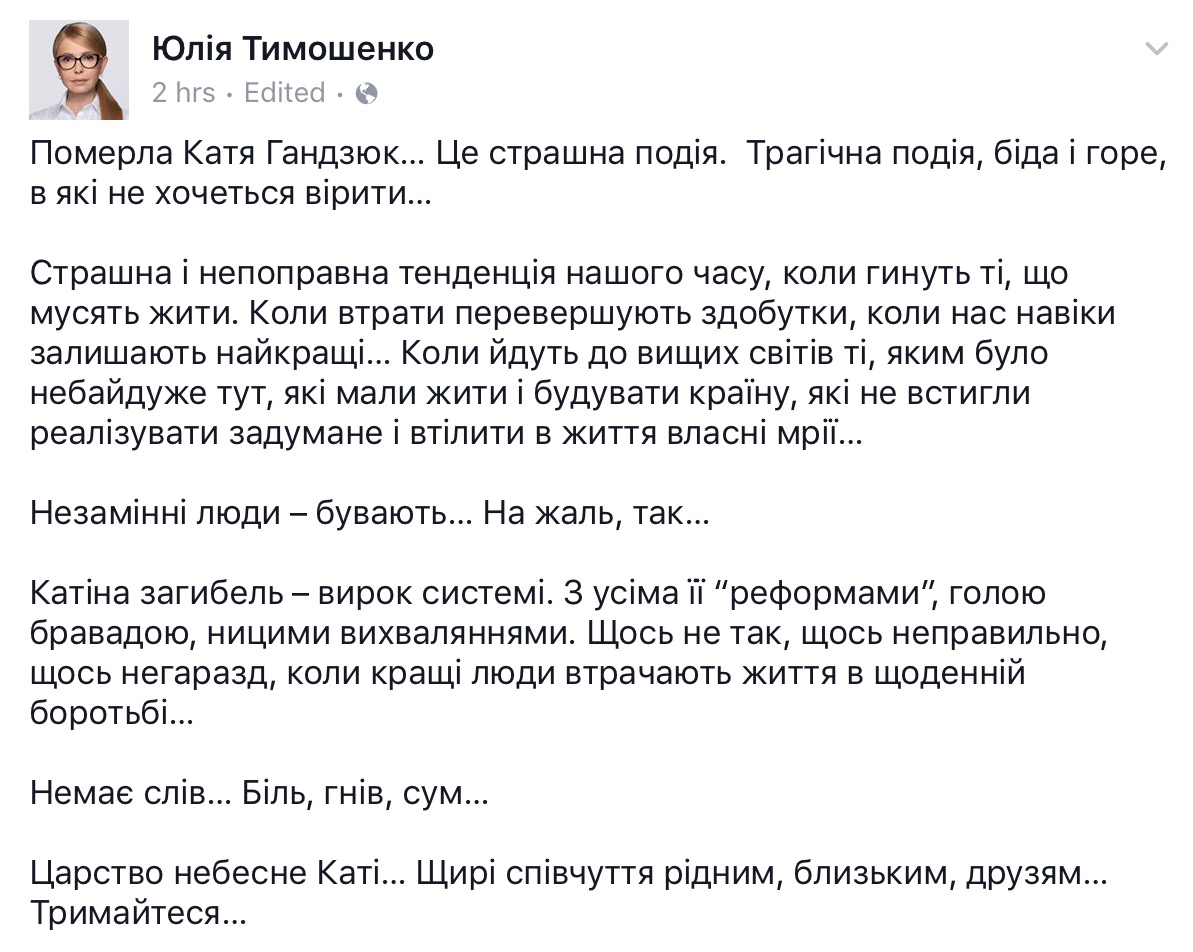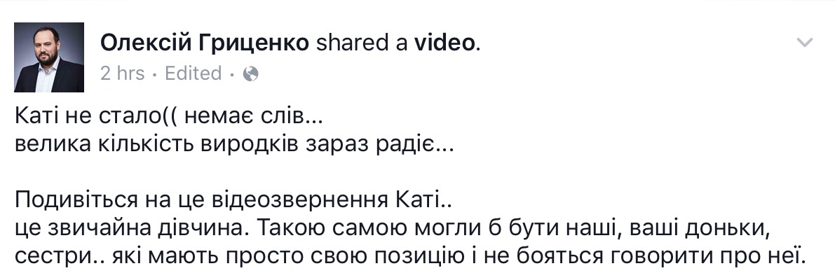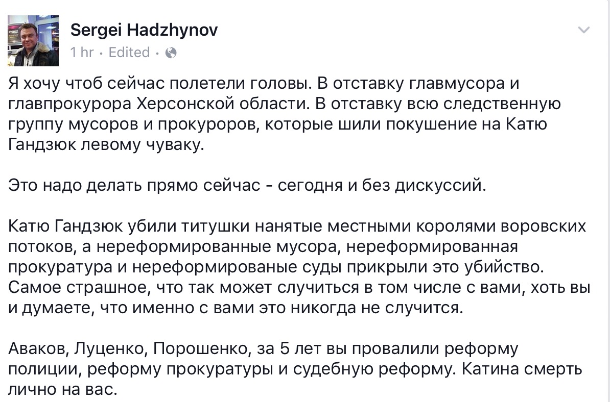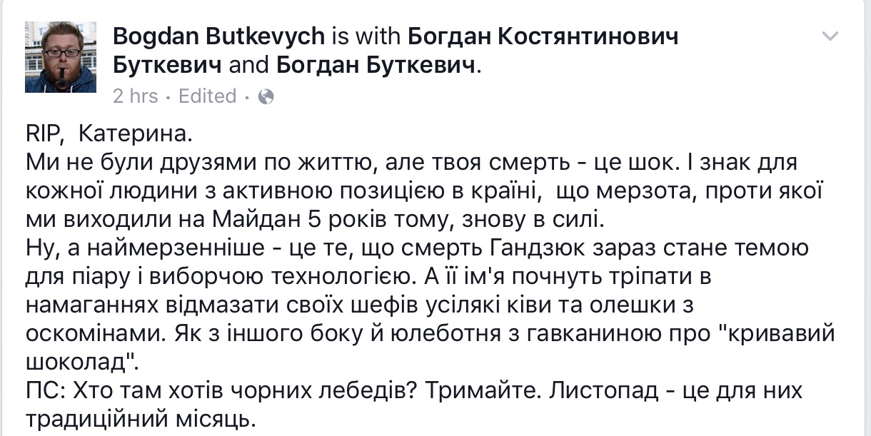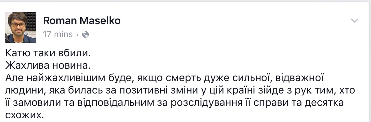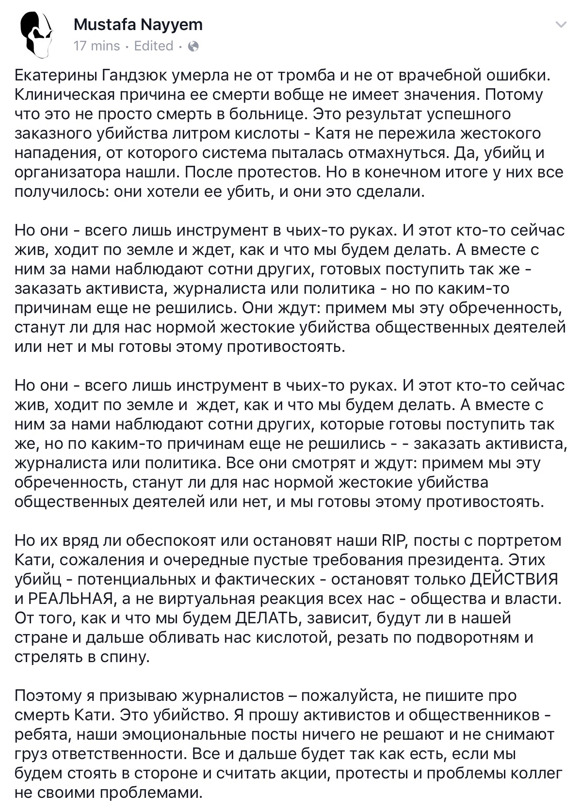 В воскресенье, 4 ноября, умерла херсонская активистка, советник мэра Херсона, и.о. управляющего делами исполнительного комитета Херсонского горсовета Екатерина Гандзюк. За несколько месяцев до этого, в июле, девушку облили серной кислотой, в результате чего она получила более 30% ожогов кожи. Воскресным вечером в Украине прошли акции памяти Гандзюк. Пользователи социальных сетей также бурно отреагировали на гибель девушки. FaceNews собрал реакции.