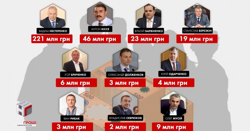 Киевские квартиры записали на жен и другую родню и получают компенсацию нардепы-миллионеры: Вадим Нестеренко (БПП), Антон Киссе (Возрождение), Виталий Барвиненко (Возрождение), Станислав Березкин (депутатская группа "Воля народа"), Игорь Бриченко (Народный Фронт) Александр Долженков (Оппозиционный блок), Юрий Одарченко (Родина), Иван Рыбак (БПП), Владислав Севрюков (БПП), Олег Мусий (внефракционный депутат).