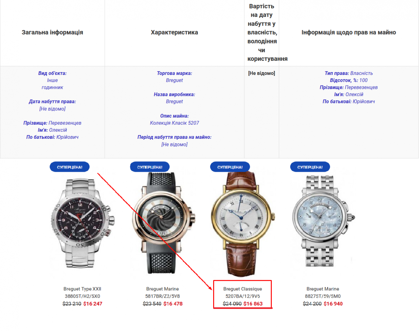 Также в декларации чиновника Перевезенцева указано, что он владеет лакшери-часами Breguet, стоимость которых почему-то указывать не стал. Но наши журналисты выяснили, что часы стоили на момент покупки около полумиллиона гривен.