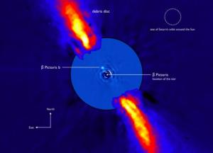 И центральная звезда, и планета молоды, возраст звезды оценивается всего в 12 миллионов (не миллиардов!) лет, а планета еще моложе. Звезда массивнее и горячее нашего Солнца, а планета относится к суперюпитерам. Масса беты Живописца b больше массы Юпитера в 12 раз, радиус – в 1.7 раза. Большая полуось орбиты планеты 9.2 астрономической единицы, почти, как у Сатурна в нашей системе, период обращения 21 год. Расстояние до системы бета Живописца 63 световых года. При такой комбинации расстояний разделить планету и звезду при наблюдениях с Земли крайне сложно.
