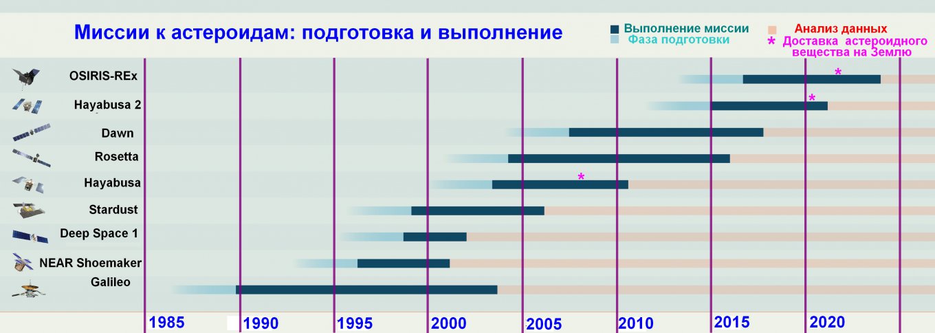 Из 8-ми миссий, в ходе которых были исследованы некоторые астероиды, только 3 были нацелены именно на астероиды, и по плану работы должны доставить на Землю астероидное вещество (на рисунке они отмечены звездочками).