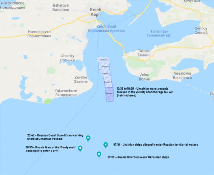 В течении дня корабли береговой охраны России продолжали блокировать маневры трех украинских кораблей. Для физического блокирования узкого прохода под Керченским мостом было использовано большое грузовое судно, а отдельная группа из трех украинских военно-морских судов в Азовском море вынуждена была вернуться на базу в Бердянске.