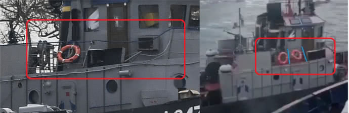 Из этой записи видно, что российский корабль "Дон" (отличительная черта - 30-мм пулемет, видимый в кадре, который также присутствует на более ранних фотографиях корабля), в течении часа после восхода солнца (восход солнца 25 ноября в этом районе был в 7:46) в третий раз протаранил буксир. Кроме того, в видеоролике голос (командир "Дона") кричит "восемь двадцать один" сразу после столкновения.