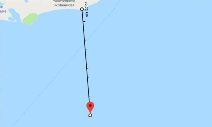 Как видно из приведенного выше изображения, данные ФСБ, если они верны, показывают, что "Бердянск" находился на расстоянии 22,72 км от побережья аннексированного Крыма и более чем в 500 м за пределами территориальных вод, которые Россия считает своими, когда по нему был открыт огонь.