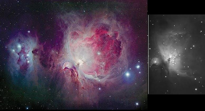 Можно сравнить современный цветной и старый черно-белый снимки туманности Ориона. На современном снимке видна сложная структура газовых потоков. Четкость снимка такая, что возникает ощущение трехмерного изображения.