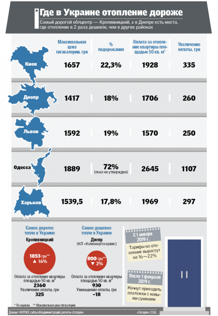 По информации НКРЭКУ, повышенные расценки вступят в силу с 1 января 2019 г., а первые платежки с увеличившимися суммами люди получат после 1 февраля. "Сегодня" оценила, на сколько подорожает тепло в городах-миллионниках, а также в каком из облцентров оно самое дорогое и самое дешевое. Как видно из инфографики, среди облцентров лидирует Кропивницкий, среди миллионников — Харьков. В то же время в Днепре, где несколько поставщиков тепла, для жителей трех жилмассивов, расположенных рядом с Приднепровской ТЭС, гигакалория стоит всего 800 грн, или почти вдвое дешевле, чем в среднем по городу. Более того, по данным НКРЭКУ, тарифы даже удалось снизить с января на 2% Как разъяснили нам в городском КП "Комэнергосервис", обслуживающем эти жилмассивы, они не используют дорогой газ, а получают теплоноситель нужной температуры непосредственно от ТЭС. А тарифы снижены за счет модернизации теплосетей и сокращения теплопотерь.