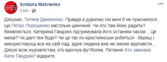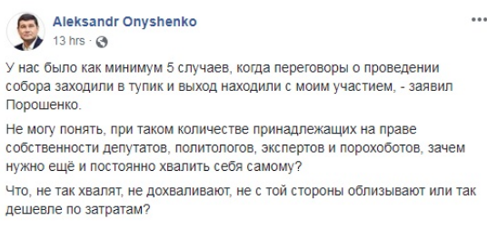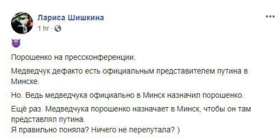 "Де-факто Медведчук — представитель Путина на этих переговорах и является, возможно, единственным источником, каналом для донесения информации. Если стоит вопрос перед президентом Порошенко, что он должен встречаться и готовить любые предложения, которые помогут вернуть наших парней и девушек домой, я буду это делать и буду встречаться", — заявил президент.