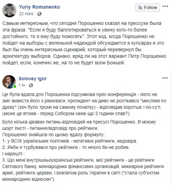 Отвечая на вопросы, президент коснулся и своего политического будущего. По словам Петра Порошенко, он еще не готов объявить о том, будет ли баллотироваться в марте 2019 года. Кроме того, в случае своего неучастия в выборах президент готов помогать "кому-то более достойному". Тем не менее, отвечая на вопрос об оппонентах, Порошенко отметил, что оппонентов у него нет. "Я являюсь президентом Украины. Они пока или лидеры фракций, или общественные деятели, которые проводят свои кампании. Это их право. Я их своими оппонентами по состоянию на сейчас не считаю", — объяснил Порошенко.