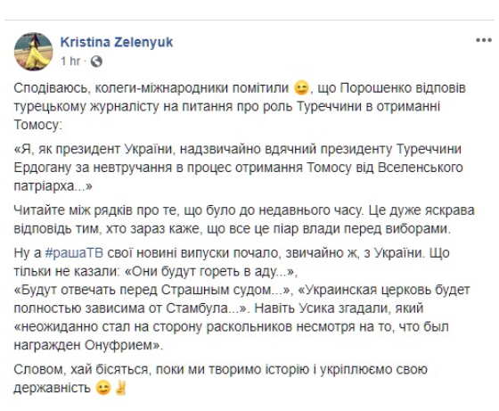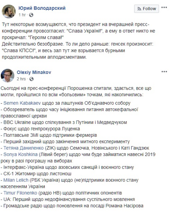 С подачи пресс-секретаря президента, первыми разрешили задать вопросы, касающиеся вопросов религии. Президент рассказал, что Объединительный собор был проведен абсолютно образцово, но признался, что переговоры по его организации как минимум пять раз заходили в тупик. А выходили из тупика благодаря его, Петра Порошенко, дипломатическим талантам.