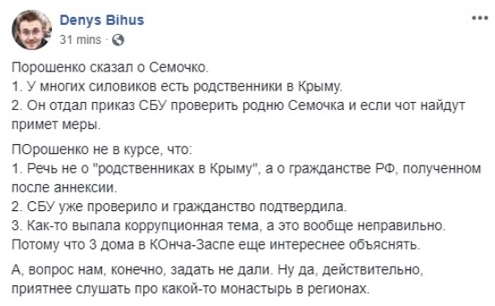 После вопроса о замглавы Службы внешней разведки Сергее Семочко, у гражданской жены которого и ее дочери обнаружилось российское гражданство, Порошенко заявил, что все государственные служащие, у которых есть родственники с гражданством РФ, будут подвергнуты проверке.
