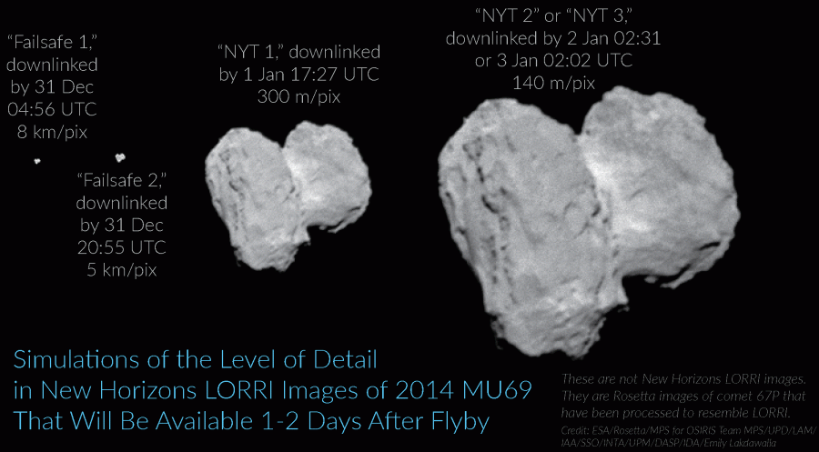 Смоделированное изменение вида объекта 2014 MU69 в поле зрения бортовой камеры LORRI. Самое детальное изображение с разрешением 140 метров на пиксель попадет на Землю только 3 января.