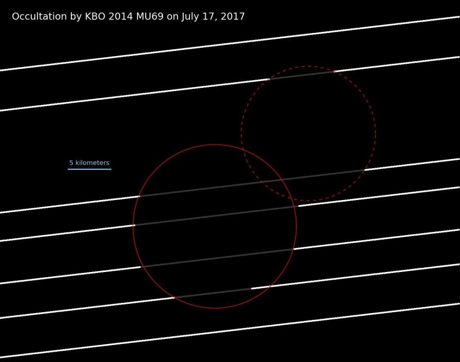 На рисунке собраны наблюдения семи телескопов. Два из них оказались за пределами полосы покрытия. Для пяти команд, добившихся успеха, белыми линиями показаны треки звезд в поле зрения, тонкие серые отрезки соответствуют покрытиям. Красными окружностями показна грубая модель Ультима Туле.