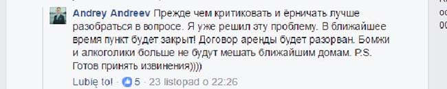 Естественно, что все подается под благовидным предлогом защиты граждан от бомжей. При этом реальные бомжи под пунктами, «ушедшими под крышу» нужных людей, Андреева как не волновали, так и не волнуют, как и не сильно он переживает относительно того, что те же бомжи тусуются возле нелегальных пунктов. Но, как и положено, в нынешних коррупционных условиях работы, даже если бомжи и не собираются, то их, как и титушек – организуют. В таких вопросах нынешние представители власти не заморачиваются.