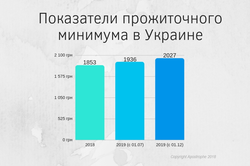 Устремятся вверх и показатели прожиточного минимума, правда, не с 1 января, а только с 1 июля. Так, до лета страна будет жить по старому минимуму: 1853 гривны в месяц на человека, а уже с июля прожиточный минимум составит 1936 гривен, а с 1 декабря 2019 года 2027 гривен.