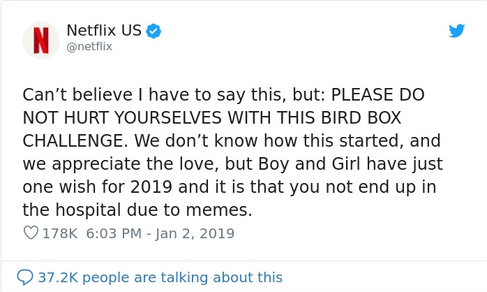 «Сложно поверить в то, что нам приходится говорить это, но: ПОЖАЛУЙСТА, НЕ НАВРЕДИТЕ СЕБЕ ЭТИМ BIRD BOX CHALLENGE. Мы не знаем, с чего все началось, и мы ценим вашу любовь, но Мальчик и Девочка на 2019 год загадали только одно желание — чтобы вы не попали в больницу из-за мемов»