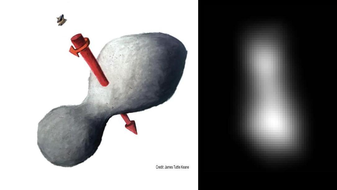 Уже по первому изображению койпероида (слева) удалось объяснить, почему космический аппарат Новые Горизонты, подлетая к цели миссии, не смог обнаружить колебаний блеска, характерных для вытянутых и двойных тел. Траектория аппарата, как ни удивительно, проходила параллельно оси вращения Ультима Туле.