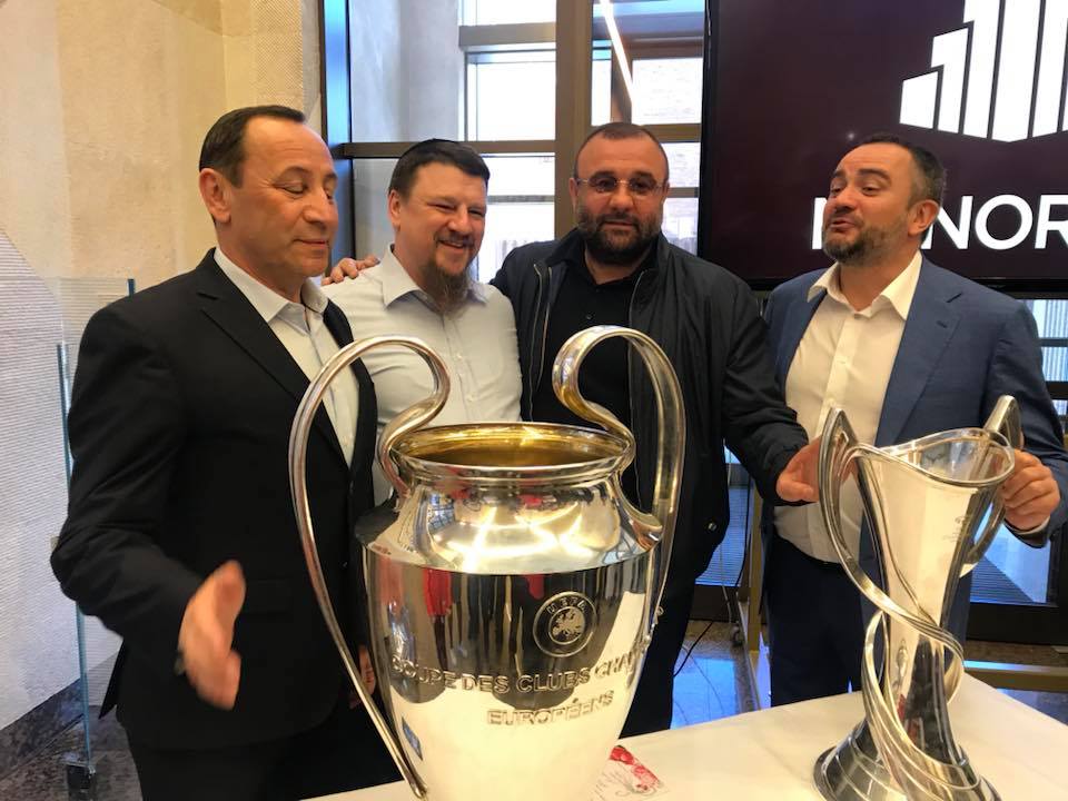 Петровский (второй справа) рядом с Павелко (первый справа) возле кубков Лиги Чемпионов. Фото: Міжнародний благодійний фонд Олександра Петровського Солідарність via Facebook