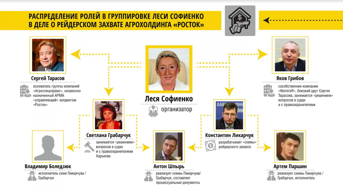 Софиенко в рейдерской схеме обеспечивает поддержку криминальных схем со стороны высших должностных лиц государственных органов и народных депутатов Украины.