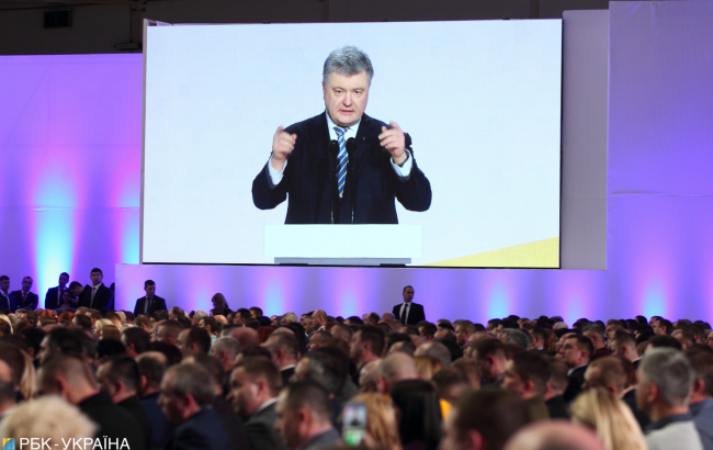 Еще перед началом выступления Петра Порошенко показали короткий видеоролик о главных достижениях страны за время его президентства, как, к примеру, формирование новой украинской армии в 2015 году, проведение децентрализации в 2016 году, получение безвиза с ЕС в 2017 году и создание автокефальной церкви в 2018 году. Но особо был выделен нынешний 2019 год, когда голос за кадром сказал, что это "год, в который победит или Порошенко, или Путин". "Победа Порошенко – это крах плана Кремля по уничтожению украинского государства", – прозвучало на весь зал.