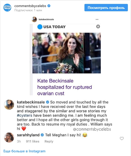 «Я тронута всеми добрыми пожеланиями, которые я получила за последние несколько дней, и ошеломлена подобными и худшими историями, которые мне отправляли мои #cysters. Я чувствую себя намного лучше, и я надеюсь, что все другие девушки, проходящие через это, тоже. Скоро вернусь, чтобы возобновить свои королевские обязанности. Уильям передает вам привет!»Кейт недавно прошла через болезненный этап, когда пережила разрыв кисты яичника. 45-летняя британская актриса поделилась фотографией себя, лежащей на больничной койке с кислородной трубкой и не совсем счастливым выражением лица. Она получила огромное количество откликов от поклонников, коллег и всех, кто пожелал ей добра, и скорейшего выздоровления.