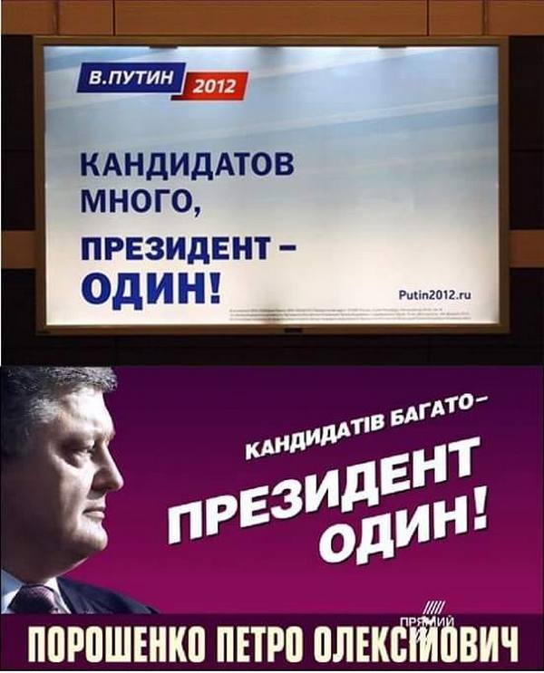 Первый слоган, "Кандидатів багато — президент один!" является практически полной калькой с российских бордов "Кандидатов много, президент — один!" с выборов 2012 года. Идентичными можно считать и борды Петра Порошенко "Реальні справи, а не брехливі обіцянки!", которые повторяют лозунг партии власти на выборах в РФ "Единая Россия — партия реальных дел" (и ее интерпретации — "Реальные дела — Единая Россия!" или "Реальные дела ... (фамилия конкретного чиновника)". Скандальные борды установлены как в больших городах, так и на междугородных трассах — пользователи "Фейсбука" выкладывают фото и видео агитпродукции "Реальні справи...", расположенной вдоль "убитых" трасс с ямами, добавляя ироничные подписи.