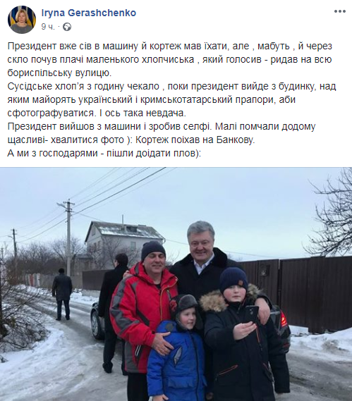 Показательна пиар-активность президента в масс-медиа, в т. ч., социальных сетях: близкие к главе государства деятели (например, вице-спикер Ирина Геращенко) прямо "разгоняли" в соцсетях "слезоточивую" историю со школьником, который якобы поднял скандал, чтобы сделать селфи с Петром Порошенко. "Президент уже сел в машину, и кортеж должен был ехать, но, может, и через стекло услышал плач маленького мальчишки, который рыдал на всю бориспольскую улицу. Соседский мальчик с час ждал, пока президент выйдет из дома, чтоб сфотографироваться", — подписала Геращенко фото президента с двумя детьми и их отцом.