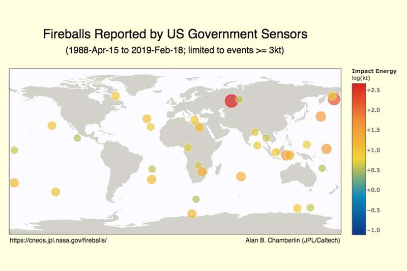 Карта зафиксированных падений "камней с неба" с мощностью взрыва больше 3-х килотонн тротилового эквивалента за период с апреля 1099 по февраль 2019.