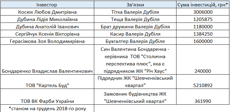 По состоянию на декабрь 2018 года около 6,5 миллионов гривен в имущественные права на квартиры вложили ООО «Картель Буд» и ООО «ПКФ «Фарбы Украины» – компании, которые сейчас строят скандально известный долгострой в центре Киева – ЖК «Шевченковский квартал».