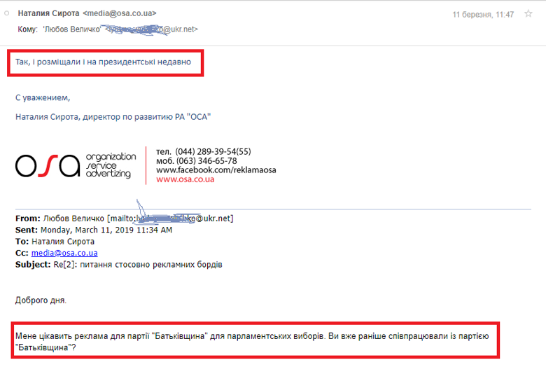 «Да, размещали. И на президентские (выборы – ред.) недавно тоже», – прокомментировала Наталья Сирота, директор по развитию РА «ОСА». – У вас запрос по Киеву? Я могу предложить наши борды под «Батькивщину» по Киеву. Реклама и сейчас размещается, но не напрямую, а через агентства».