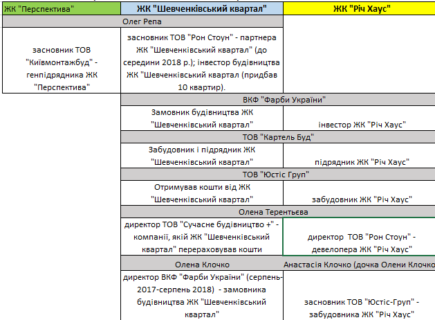 Таблица связей Олега Репы со строительством ЖК «Шевченковский квартал» и ЖК Rich House
