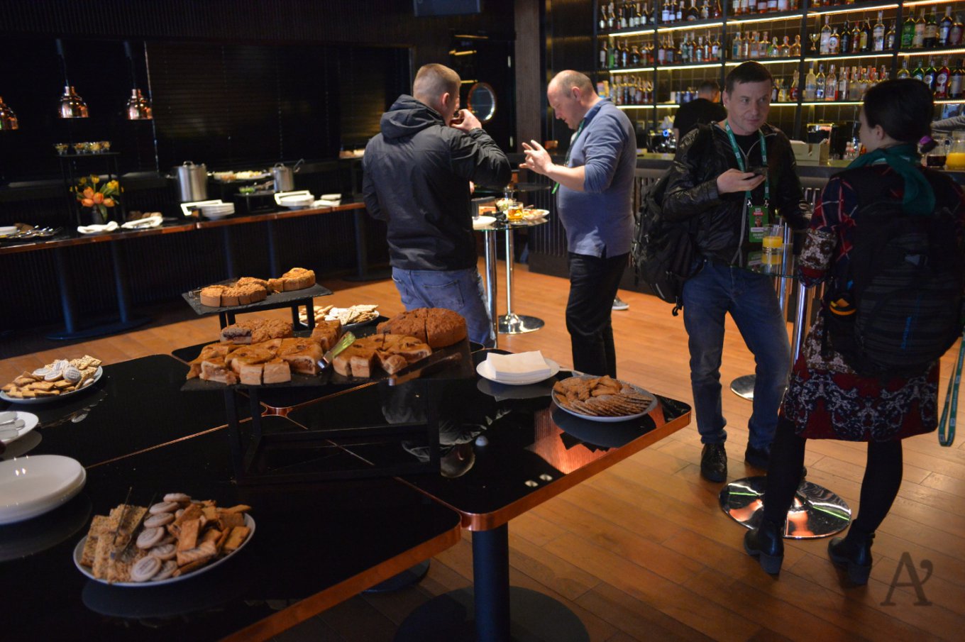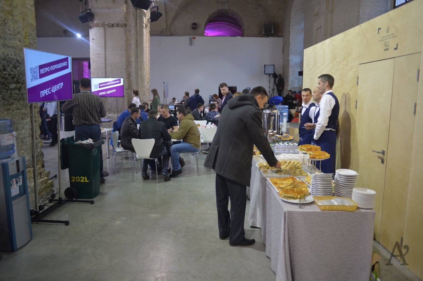 Брифинги членов команды - это было едва ли не единственное разнообразие дня в штабе. А главным развлечением - конечно же, фуршет. Большого выбора на столах не было, ограничились бутербродами, кексами, пирогами, бургерами и сосисками. Запивать официанты предлагали кофе, чаем и соками. Хотя мужчин, которые обслуживали гостей штаба, очень тяжело назвать официантами. Их лица были угрюмые, серьезные, а при виде камер, просили их не фотографировать. Они больше напоминали сотрудников Государственной охраны, которых замаскировали в официантов, отмечали многие присутствующие.