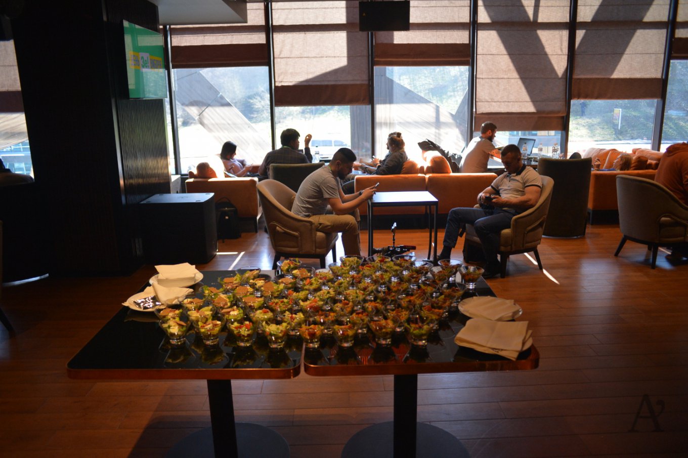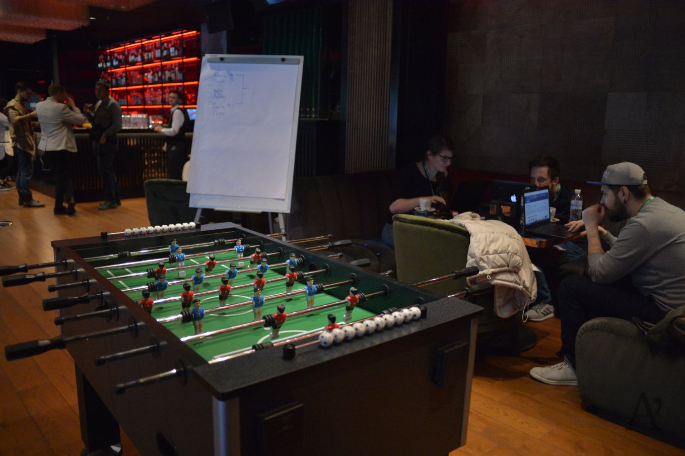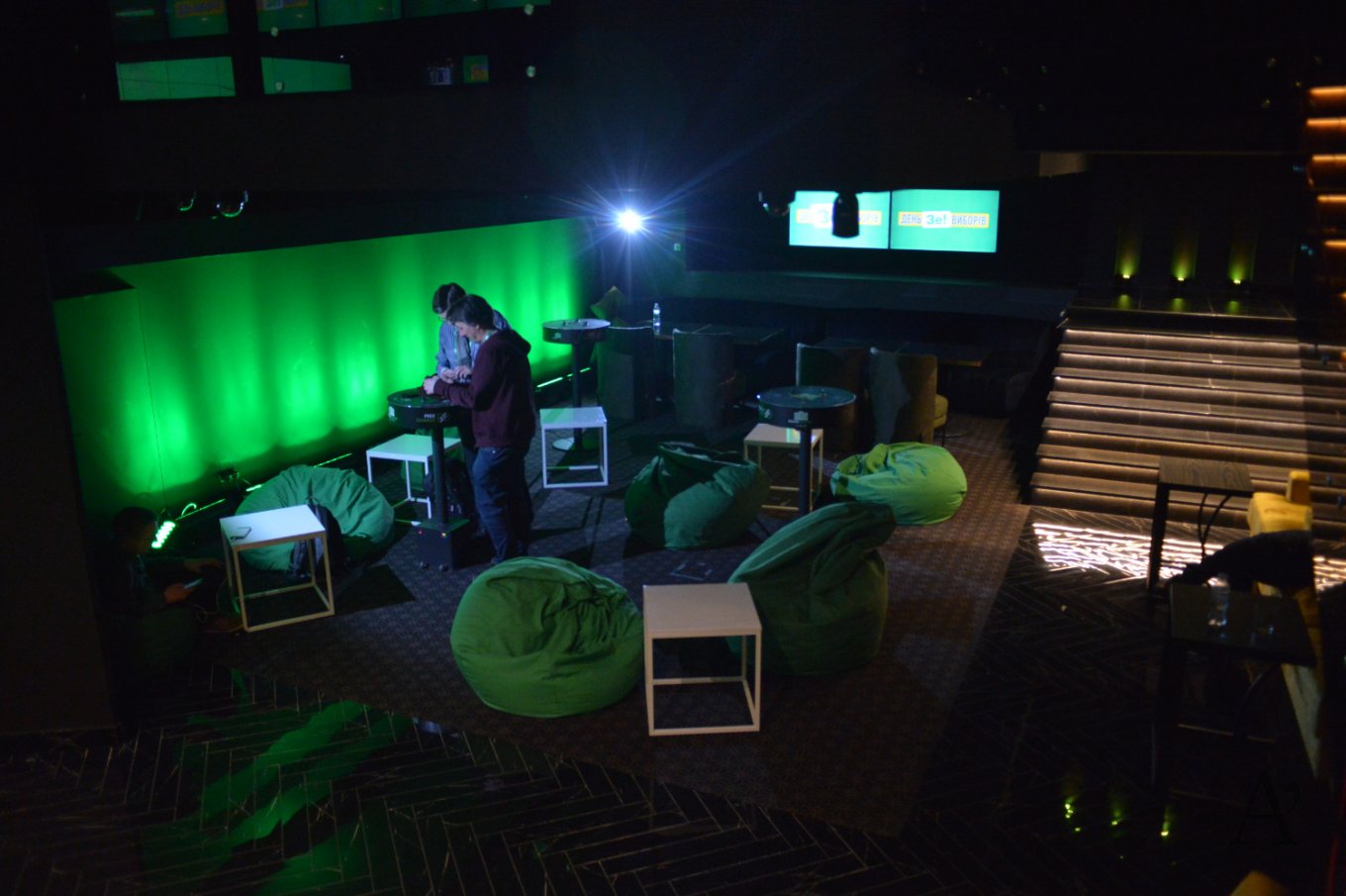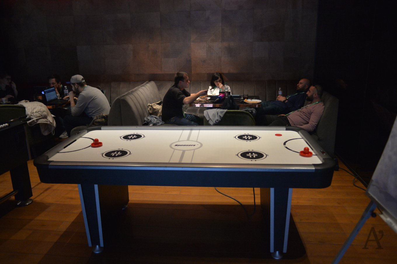 Рабочее пространство в штабе Зеленского напоминало больше модную тусовку, или презентацию нового клипа Олега Винника, но никак не политическое мероприятие: на столах легкие закуски, шампанское и вино на выбор. Рядом зоны для непринужденного фана: настольный теннис, аэрохоккей, PlayStation. Фоном - модный британский лаунж и шутки Евгения Кошевого, Сергея Сивохи и Валерия Жидкова, которые пришли поддержать кандидата.