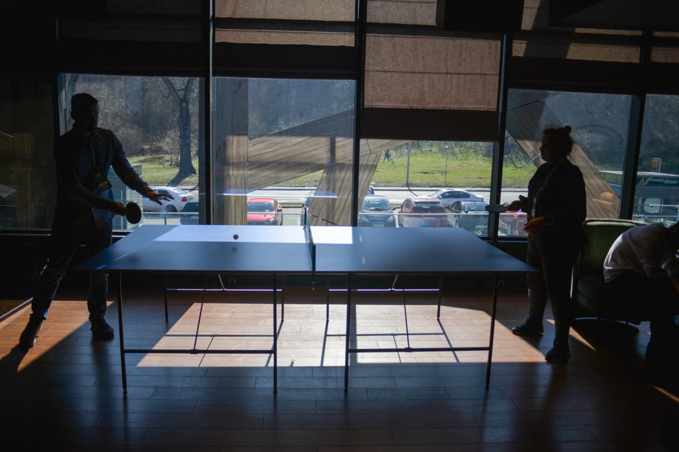 За полчаса до закрытия избирательных участков в штабе появился Владимир Зеленский. Но первым делом шоумен взял в руки не микрофон… а ракетку для настольного тенниса и сыграл партию с одним из журналистов. Проиграв, Зеленский направился на сцену, аккурат, к оглашению результатов. К этому моменту в конференц-зале "Паркового" собралось так много журналистов, что каждый шаг давался кандидату с трудом. Благо, бодигарды шоумена работали уверенно, и Зеленскому удалось взойти на сцену.