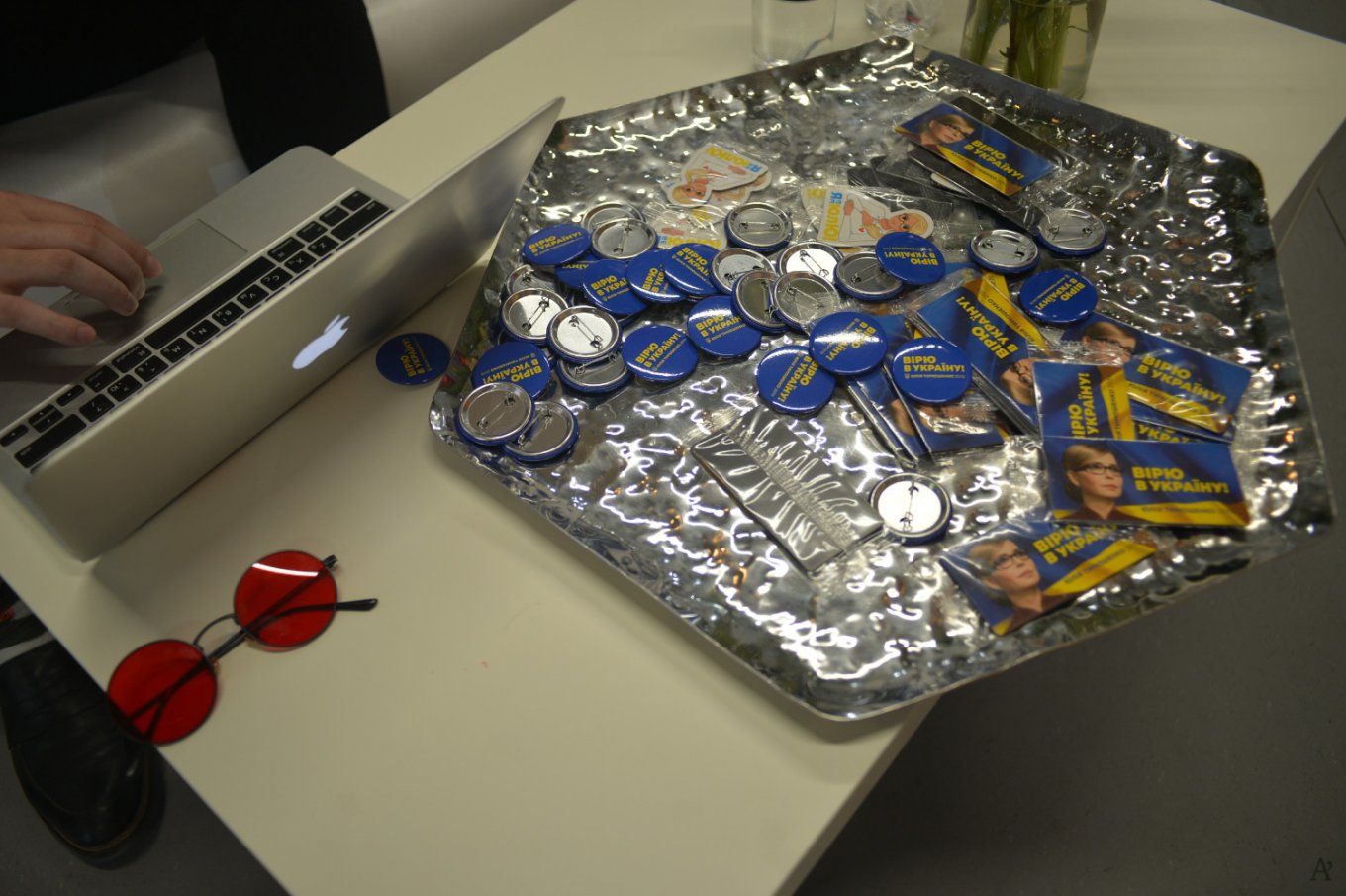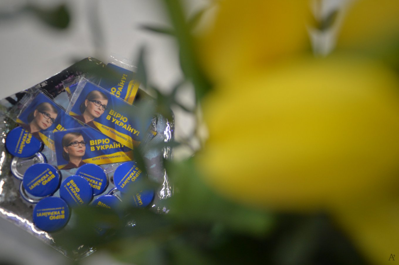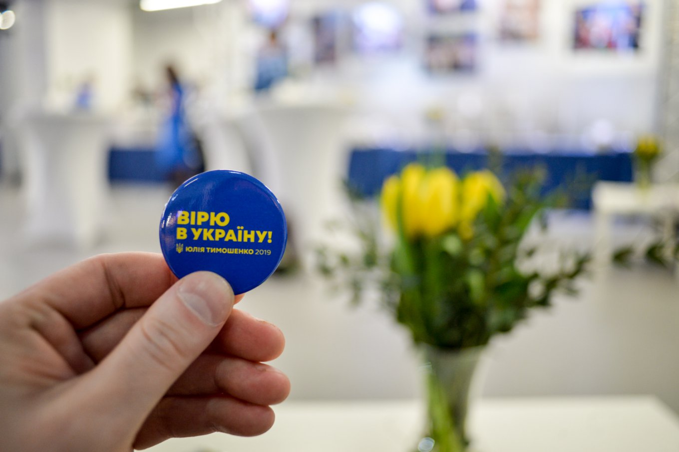 Штаб Юлии Тимошенко отличался скромностью, если сравненивать со штабами двух главных конкурентов - Порошенко и Зеленского. Относительно небольшое пространство арт-холла D12 на улице Десятинной открыло свои двери еще с полудня. На входе было много охраны, а на руки надевали браслетики почему-то бело-синего цвета.