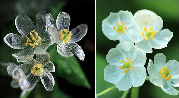 Родом из лесистых горных склонов в холодных регионах Японии «скелетные цветы» цветут с середины весны до начала лета. Их белые лепестки совершенно непрозрачны в сухих условиях, но, когда начинается дождь, они становятся кристально прозрачными. Дождь прекращается, лепестки высыхают, и цветок возвращается к своему обычному белому окрасу.