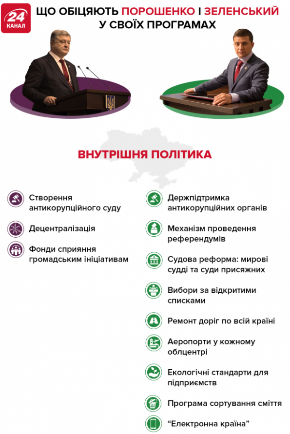 По внутренней политике кандидаты обещают тоже разное. Петр Порошенко собирается продолжать децентрализацию и наконец запустить Антикоррупционный суд.