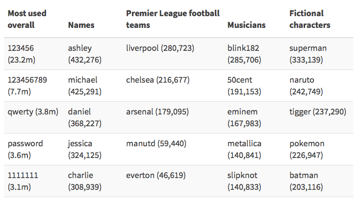 Огромное количество пользователей Интернета также выбирают простейшие для отгадывания слова, например, «password», либо распространенные имена. Полученные данные выявили серьезные пробелы пользователей в знаниях о кибербезопасности, и NCSC призвал людей с умом подходить к выбору безопасного пароля и не использовать названия футбольных команд, групп, имен и всякого рода «qwerty».