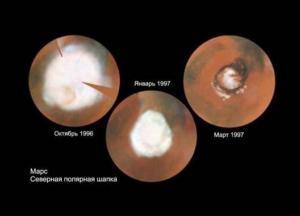 На Марсе, как и на Земле, приполярные области крашены полярными шапками. Марсианские шапки заметно отличаются друг от друга: северная шапка гораздо больше южной: 1000 километров против 300, соответственно. Лето в южном полушарии приходится на время прохождения перигелия, За счет довольно большого эксцентриситета марсианской орбиты лето южного полушария заметно теплее, чем лето северного полушария.