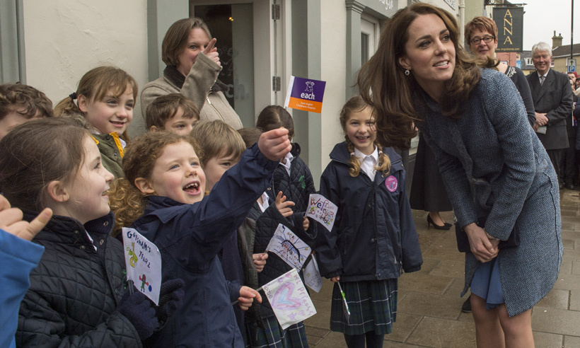 Местные школьники были рады увидеть герцогиню Кембриджскую в марте 2016 года, когда королевская особа официально открыла новый благотворительный благотворительный магазин EACH в Норфолке, Англия.