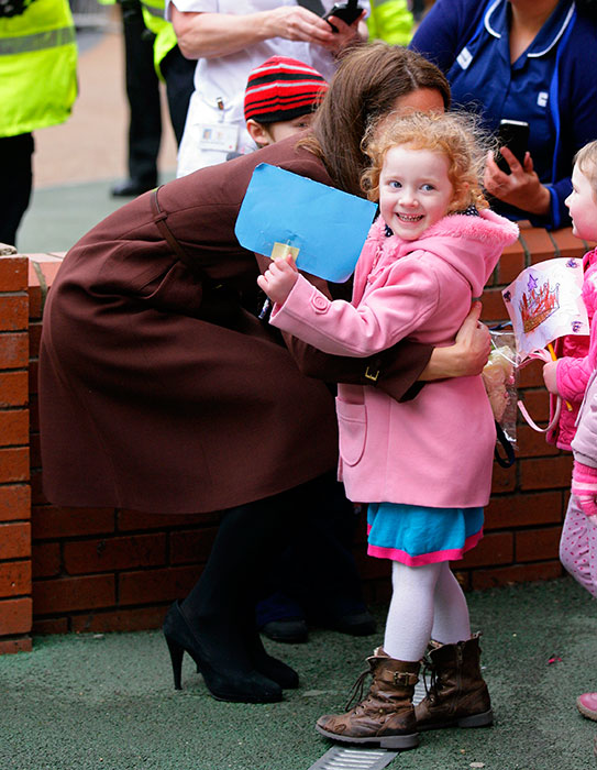 Кейт обнимается с очаровательной малышкой во время прогулки по детской больнице Олдер Хей в феврале 2012 года.