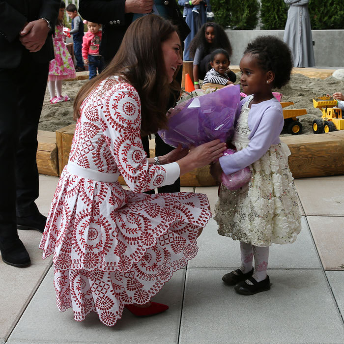 Герцогиня любезно приняла букет цветов от маленькой девочки во время посещения Нового центра по оказанию иммигрантских услуг Британской Колумбии в Ванкувере, Канада.